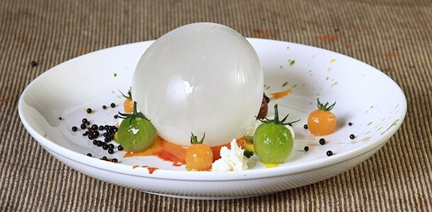 如這次所示範的「蕃茄氣球沙律」,就是由意大利經典菜色「蕃茄芝士沙律」所演變,他保留了原有的製作元素:蕃茄、水牛芝士(莫札瑞拉芝士)、橄欖油、意大利陳年葡萄醋、羅勒,但卻改為不同的形式呈現,除了將有形的蕃茄,以泥狀、慕絲狀和去皮帶蒂蕃茄三種樣態呈現,或把水牛芝士,以氣球狀作出視覺感,更將巴薩米哥醋幻化為珍珠狀點綴其中,徹底顛覆了一般對原有沙律形式的想像。