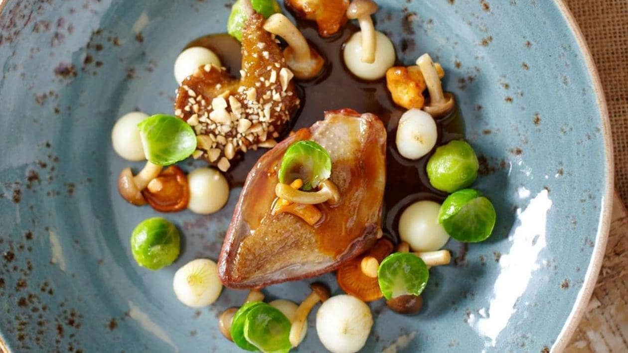 慢煮乳鴿配椰菜仔、白甜薯茸及黃菌